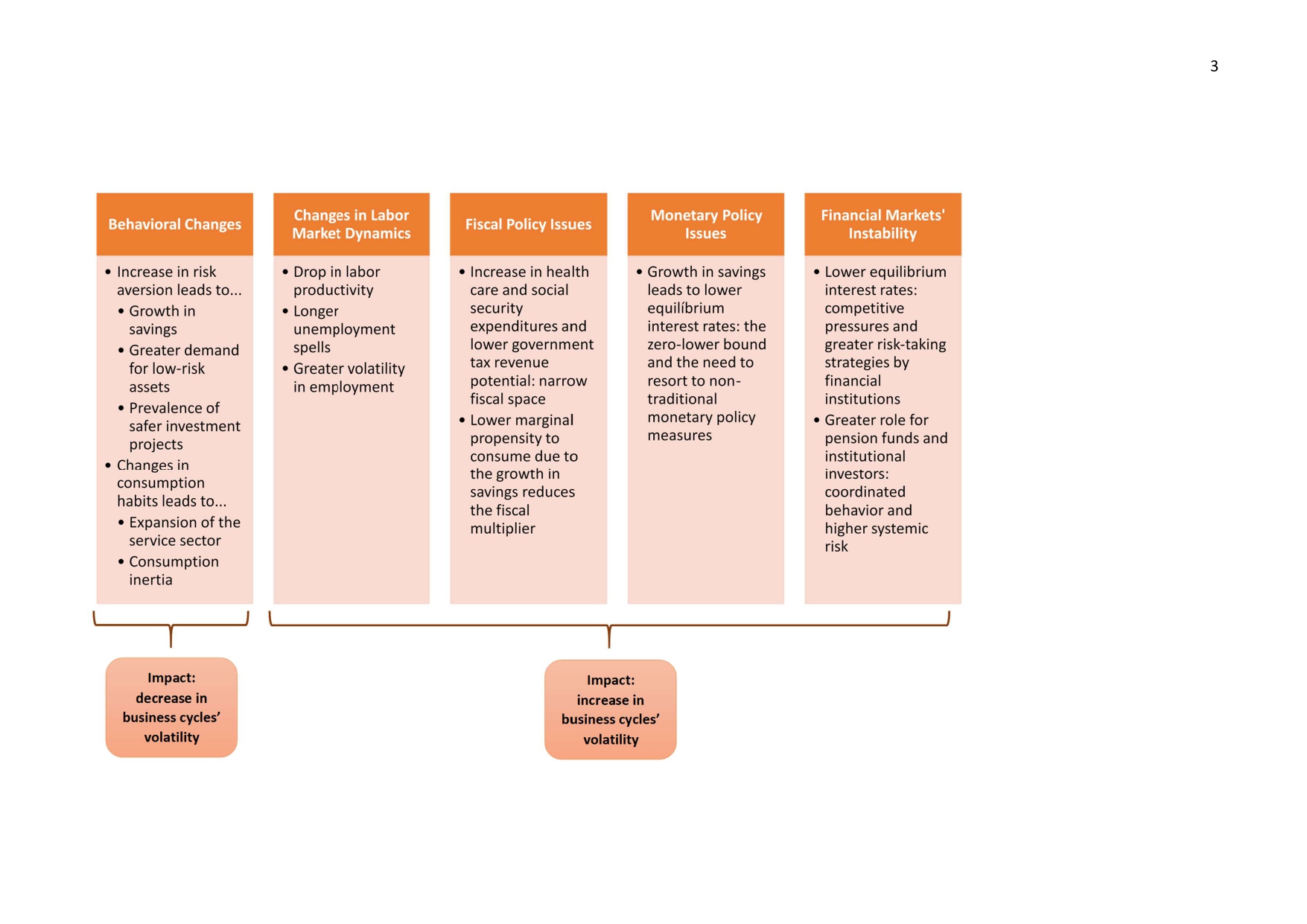 The impact of population aging on business cycles’ volatility is theoretically ambiguous. Increases in longevity modify economic agents’ behavior: consumers become more risk-averse and increase their savings to cope with longer life expectancy; consumption habits become more conservative and shift towards the service sector; firms’ managers direct their investment strategies toward safer projects as their tolerance to risk also reduce. All these behavioral changes contribute to a more stable economic environment.