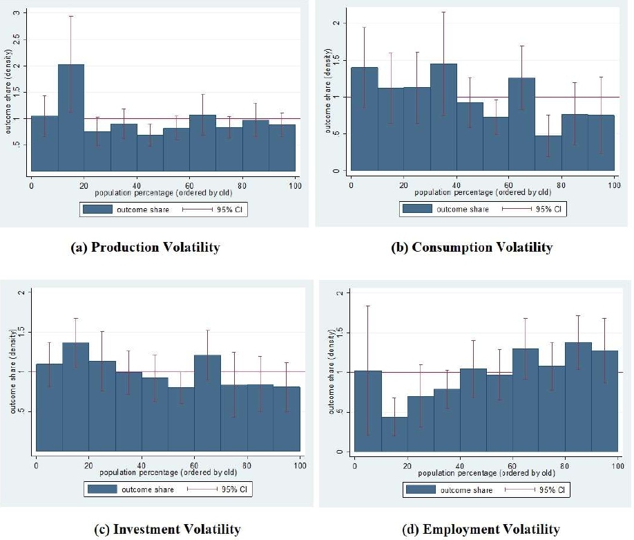 Figure 3 presents preliminary evidence that population aging appears to be related to reduced volatility in output, consumption, and investment, and increased volatility in employment. Percentile-share histograms by quantiles of DEP or PAS yield results that are similar to OLD, but the outcome by quantile of VALAB is not as clear[3]. Output, consumption, and investment volatility seem to increase as VALAB grows, while employment volatility surprisingly appears to diminish.