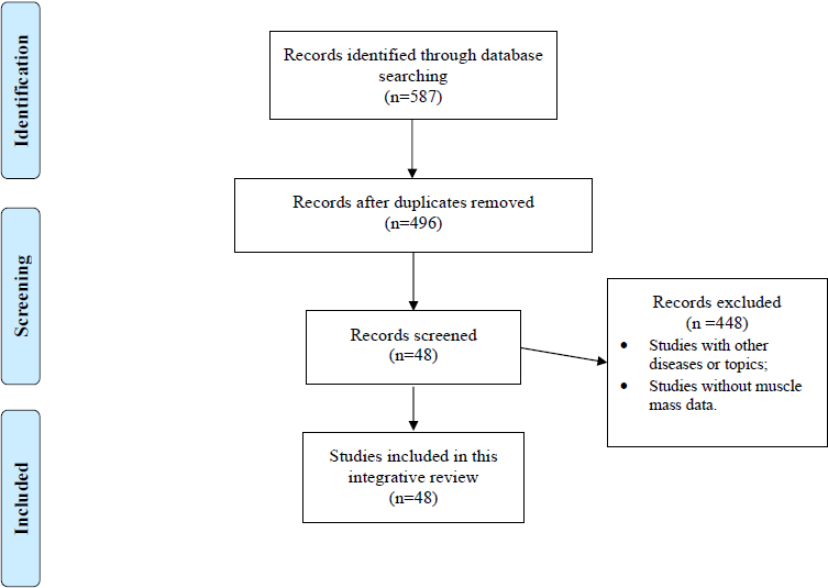 These changes in body composition may result in increased healthcare costs, functional disability, poorer quality of life and increased mortality in RA patients [19,20]. Therefore, in this integrative review, our objective was to present an overview of the impact of pharmacological treatments used in RA on body composition, with a focus on muscle mass. An electronic search was performed using MEDLINE (via PubMed) and other relevant sources. Keywords and medical subject headings for the terms ‘rheumatoid arthritis’ OR ‘arthritis’, OR ‘arthritis rheumatoid’ AND ‘body composition’ AND ‘muscle mass’, AND ‘glucocorticoids’ AND ‘conventional disease-modifying antirheumatic drugs' AND ‘biological disease-modifying antirheumatic drugs’ were selected. Randomized controlled trials or non-randomized controlled trials, cohort studies, reviews and experimental models were included. Studies with other diseases or topics or studies without muscle mass data were excluded. The flowchart of this integrative review is in (Figure 1).