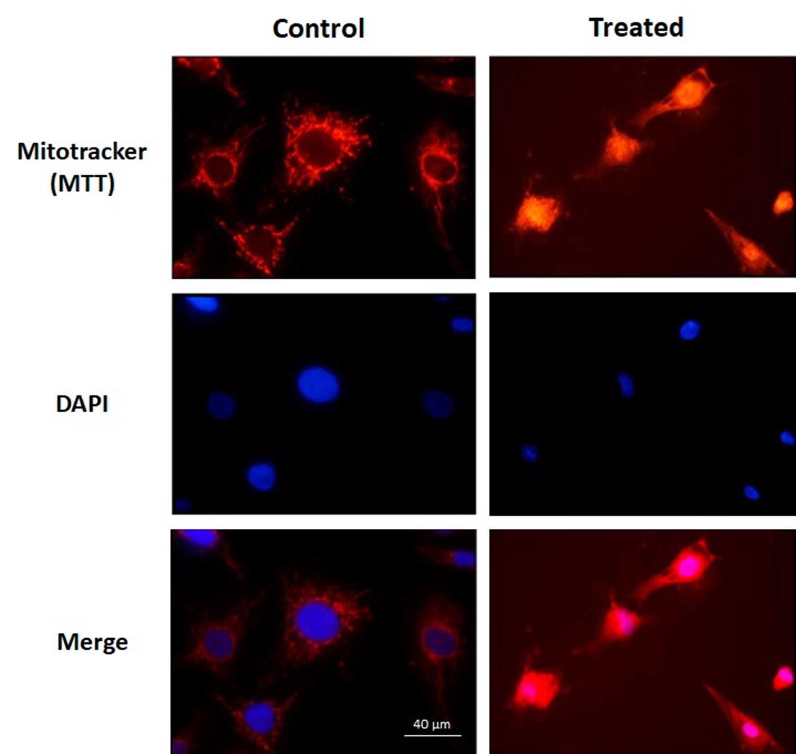 After treatment, the cells attached to the coverslips were stained with MTT, which was prepared on dimethyl sulfoxide (DMSO) and added to the cell culture medium at a final concentration of 1 µmol/L (1:10000, prepared in DMEM without FBS). After 30 minutes incubation at 37°C, the cells were washed with PBS 1X (pH 7.4, 8 g/L NaCl, 0.2 g/l KCl, 0.24 g/L KH2PO4, 1.44 g/L Na2HPO4) and they were fixed with methanol at -20°C for 30 minutes. Cells were washed 3 more times with PBS 1X to ensure that any methanol residue had been removed. The cells were later stained with DAPI (1:500 dilution from a stock solution of 5 mg/ml). This was incubated for 30 minutes at room temperature in darkness and gentle stirring. The cells were then washed 3 times with PBS after the incubation time, and the samples were prepared for viewing under the microscope. The cells were examined using a fluorescence microscope (NIKON Eclipse TiS) equipped with standard filter sets to capture fluorescent signals. Images were collected using a digital camera.