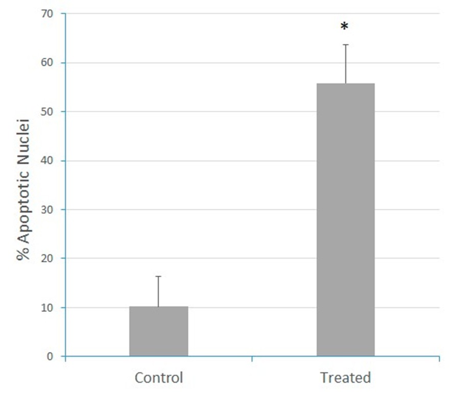 Figure 1: The liposoluble extract of N. glauca induces apoptosis in RD cells. Cell cultures were treated with the liposoluble extract of N. glauca for 2 h (Treated) or maintained in DMEM without serum for 2 h (Control). Cells were then stained with MTT Red (red) and subsequently fixed and stained with DAPI (blue), as described in the Methods section. Morphological analysis of fluorescence-stained nuclei and percentages of apoptotic cells at each condition are shown. At least ten fields per dish were examined. Each value represents the mean of three independent experiments. Averages ± S.E.M. are given; *P <0.05 with respect to the control. Magnification: 63X.