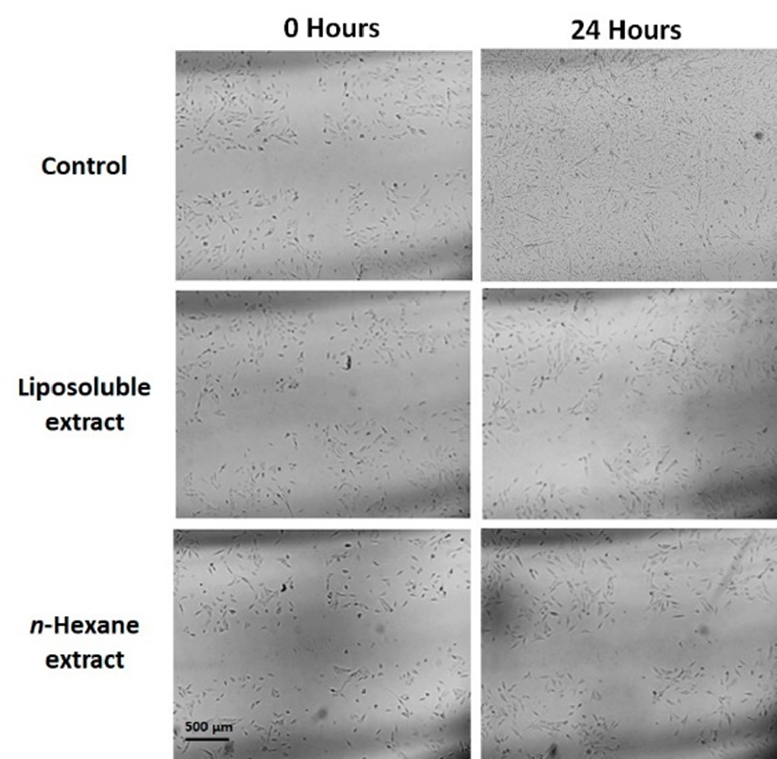 The effects of the extracts of N. glauca on the cell cycle and cell migration were then analyzed. After reaching 100% confluence, RD cells were treated for 1 hour with either n-hexane or the liposoluble extract. A cross-shaped wound was then created, and the closure of the central area of the wound was monitored every 20 minutes under a light microscope. Figure 2 shows the images captured at zero hours (after creating the wound and replacing the medium with serum-containing culture medium, 0% of wound occupancy) and at 24 hours (end of the assay). The treatment with the liposoluble extract and the n-hexane sub-extract significantly inhibited the division capacity and likely reduced cell migration (3% and 1% of wound occupancy, respectively) compared to the control, where complete wound closure was observed 24 hours after the start of the assay (95% of wound occupancy) (Figure 2). These findings indicate that N. glauca extracts also impact the cell cycle, resulting in a reduced rate of cell division and potentially affecting cell migration.