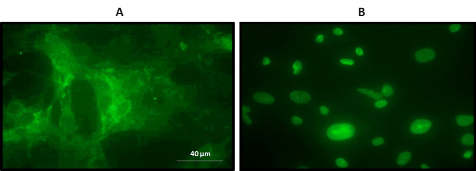 Figure 3: β-catenin is localized in the nucleus of RD tumor cells. Immunocytochemistry assays using a primary antibody specific against β-catenin and then a secondary conjugated to a fluorophore (Alexa 488). A. C2C12 cells: β-catenin with cytoplasmic and membrane-proximal localization. B. RD cells: β-catenin with nuclear localization. Magnification: 63X.