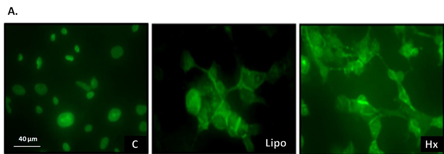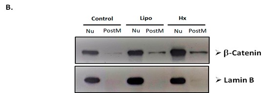 Figure 4: Extracts from N. glauca induce changes in the subcellular localization of β-catenin protein in RD cells. A. Cells cultured on coverslips were treated for 1 hour with the vehicle of the extracts (C), with the liposoluble extract (Lipo) or with the n-hexane sub extract (Hx). Cells were fixed, permeabilized, and incubated with a primary antibody specific for β-catenin and a fluorophore-labeled secondary antibody. Nuclear localization was observed in the control (C). In the cells treated with the extracts (Lipo and Hx), β-catenin was detected in the nucleus and cytosol, mainly located near the plasmatic membrane. Magnification: 63X. B. The subcellular fractions obtained after the different treatments were isolated and quantified. 20 µg of protein from each fraction were analyzed by Western blot assays. The membranes were incubated using a specific antibody against β-catenin and subsequently with the peroxidase-conjugated secondary antibody, as detailed in Methods. The nuclear fraction (Nu) and the post-mitochondrial fraction (PostM) were evaluated under control conditions (C), liposoluble extract (Lipo) and n hexane sub extract (Hx).