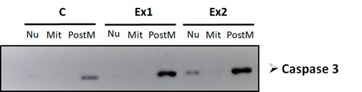 Figure 6: The liposoluble extract of N. glauca increases the cleaved (active) form of Caspase 3 and its nuclear localization. The subcellular fractions obtained after the different treatments were isolated and quantified. 20 µg of protein from each fraction were analyzed by Western blot assays. The membranes were incubated using a specific antibody against the active form of Caspase 3. The nuclear (Nu), mitochondrial (Mit) and the post-mitochondrial fraction (PostM) obtained from cells treated with the liposoluble extract for 1 hour (Ex 1), 2 hours (Ex 2), and cells maintained in DMEM (C) were analyzed.