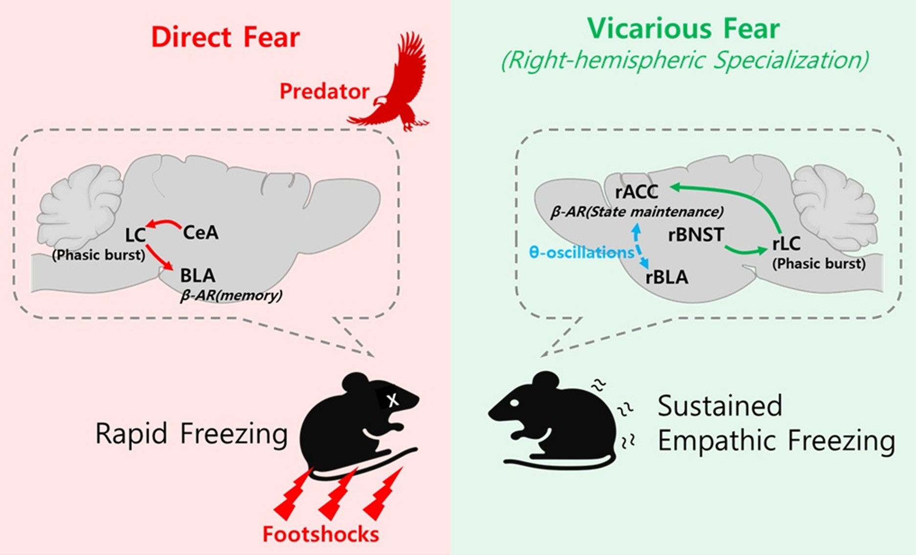 The selective involvement of the right LC in observational fear can be understood at multiple mechanistic levels. At the receptor level, norepinephrine exerts distinct effects depending on arousal state. Activation of α2A-adrenergic receptors in the medial prefrontal cortex stabilizes recurrent network activity during moderate arousal, providing a mechanistic template for how noradrenergic modulation can maintain sustained representations of emotionally salient information [17]. By extension, similar receptor dynamics may operate in the ACC during observational fear, helping to stabilize empathic states once initiated. In the ACC, α1-adrenoceptor signaling did not significantly contribute to observational freezing [4], suggesting that α2A-mediated mechanisms, rather than α1-mediated excitation, may be critical for stabilizing empathic states during observational fear. Under conditions of higher arousal, norepinephrine engages β-adrenoceptors, which enhance neuronal excitability and modulate synaptic plasticity [18–21]. This mechanism appears particularly relevant for vicarious fear, since socially acquired threat cues are inherently indirect and less salient than direct aversive experiences. By boosting synaptic gain and facilitating long-term plasticity, β-adrenoceptor signaling reinforces socially derived threat memories, ensuring that observational fear is consolidated and maintained beyond the immediate context. By contrast, direct fear relies less on sustained neuromodulation and more on rapid transmission through the amygdala. Phasic sensory input quickly activates CeA inhibitory microcircuits, which in turn drive downstream hypothalamic and brainstem effectors to produce acute freezing [15,16]. In this state, β-adrenergic modulation of basolateral amygdala circuits facilitates the consolidation of directly experienced aversive memories [20–23], but the initiation of defensive responses can occur even without prolonged cortical involvement.
