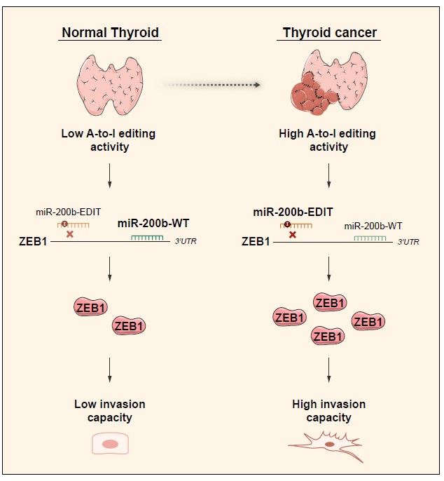 The inhibition of ADAR1 expression and A-to-I RNA editing affects thyroid cancer aggressiveness impairing proliferation, invasion and migration. The molecular mechanism encompasses the tumor suppressor miR-200b, which is over-edited in thyroid tumors weakening its ability to inhibit ZEB1. In conclusion, ADAR1 acts as an oncogene in thyroid cancer and is a new potential therapeutic target.