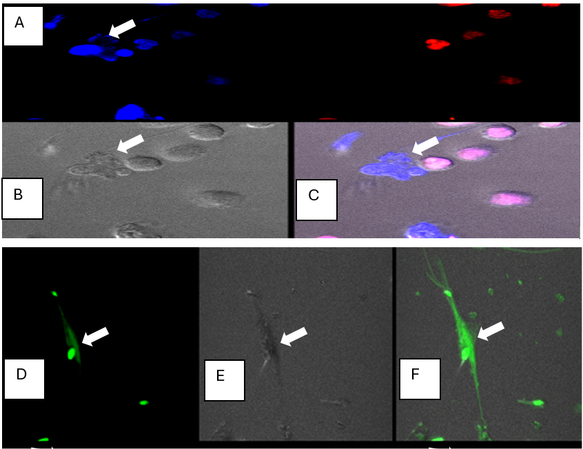 Figure 1: A-F. Fluorescent confocal microscopy images (63X) of PMN- NET formation in the presence of dead spermatozoa. PMNs and dead spermatozoa were exposed to the dicycloorange DNA stain (red color) of intact DNA in live cells, and Sytox Blue stain (blue color) of dead cells, or dicycloviolet DNA stain (green color) of dead cells. The sytox blue and dicycloviolet also stained the extruded DNA from the PMNs, which entrapped dead spermatozoa (indicated by white arrow). A) dead cells: both sperm and PMNs took up sytox-blue DNA stain, (white arrow denotes NET formed by PMN in contact with dead sperm), and live PMNs which are labeled with dicycloorange DNA stain (red) indicating they are viable with intact DNA; B) image in DIC; C) merged image with both fluorescent channels and DIC; D) PMN-NET visualized by dicylcoviolet DNA stain, showing DNA extrusion from the ruptured PMN. E) Image in DIC F) Merged image in fluorescent channel and DIC. (Adopted from Doty AL: The role of seminal plasma proteins in the interaction between polymorphonuclear neutrophils (PMNs) and spermatozoa in the horse. PhD Dissertation, University of Florida, 2012).