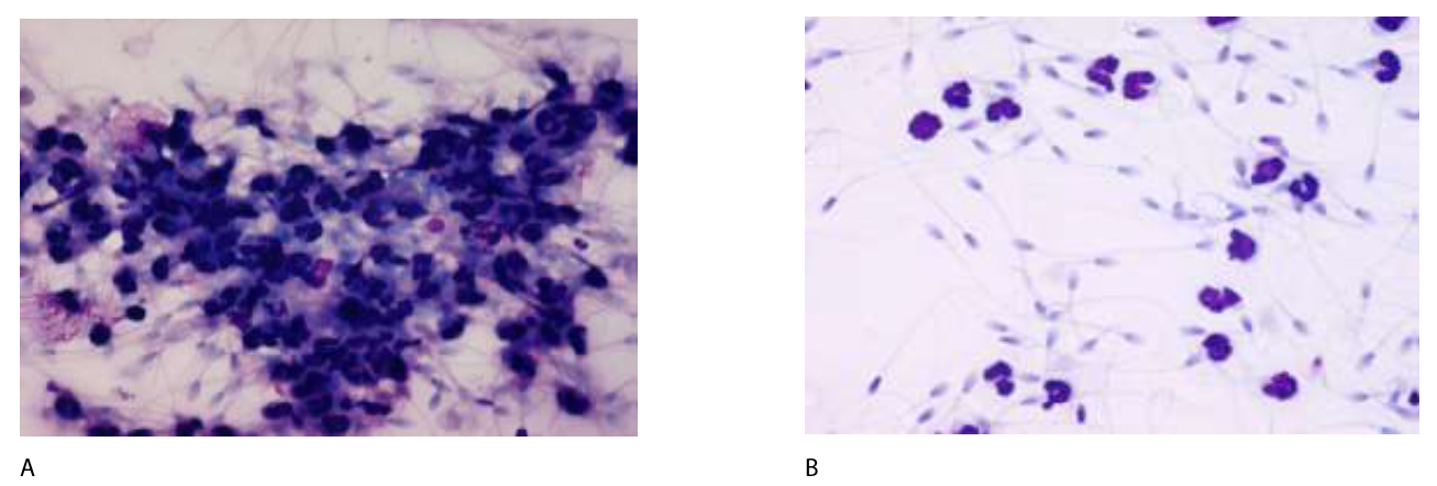 Figure 2: Photomicrographs of equine spermatozoa mixed with PMNs in the absence (A) and presence (B) of seminal plasma. Spermatozoa formed clusters with reduced motility when seminal plasma was removed from semen (A), while very little binding between PMNs and spermatozoa was observed in the presence of seminal plasma (B), allowing the spermatozoa to maintain motility.