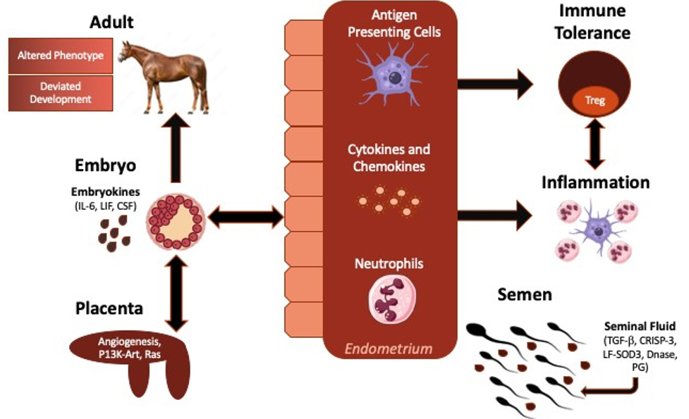 The deposition of semen into the uterus activates numerous aspects of maternal immunity, including both the innate and adaptive immune system. The compilation of seminal plasma includes various cytokines (transforming growth factor beta (TGF-β), IL-8), hormones (PG), in addition to paternal antigens. The exposure of seminal plasma to the maternal immune system is believed to activate the adaptive immune response to develop tolerance to the semi-allogeneic fetoplacental unit [15,56-57]. The impact of seminal plasma on the immune response to breeding includes activation of cytokines and chemokines from the epithelial cells, a recruitment of immune cells into the uterine lumen, and eventual activation of dendritic cells by paternal antigens [42,54,60,61]. Seminal plasma has also been found to increase the expression of various embryokines (leukemia inhibitory factor (LIF), interleukin 6 (IL6), colony-stimulating factor 2 (CSF2), tumor necrosis factor-related apoptosis-inducing ligand (TRAIL)) as well as transcripts relating to embryo health and metabolism (IGF-b) [58,59]. In the mouse, seminal plasma induces chemotactic factors for immune cells such as neutrophils, macrophages and dendritic cell, and mating of seminal vesicle-excised males to normal females decreased placental volume, litter size, and had a negative impact on the health of resulting offspring [17]. Others have suggested that seminal vesicle-derived CD38 is imperative in inducing the tolerogenic dendritic cells and CD4+FoxP3+ Tregs. This population of T-cells is believed to be essential for pregnancy maintenance, and depletion of these cells leads to implantation failure, impaired uterine vascular development, and fetal loss in late term gestation [62]. While this has not been extensively investigated in horses, we recently observed that seminal plasma regulated endometrial gene transcription that may have an impact on the environment for the embryo [63]. This can potentially alter embryo development through epigenetic effects and subsequently impacting the phenotype of the offspring. Recent work suggests that equine intracytoplasmic sperm injection (ICSI)-produced embryos were associated with postpartum placentas that had increased chorionic villi hyperplasia, edema, allantoic cysts, and necrosis [64]. Umbilical length of these ICSI-produced fetuses was also shorter in comparison to in vivo produced embryos. Additional work on in vitro produced embryos revealed that equine male offspring produced from embryo transfer and ICSI had higher weight gain during the first two years of age, compared to offspring produced from conventional AI at the same farm [65]. While advanced growth may be considered an advantage for early development in young athletes, it carries an enhanced risk of developmental diseases, such as osteochondrosis dissecans. These findings were preliminary and additional factors associated with Assisted reproductive technologies (ARTs) were not evaluated. Nevertheless, data from other species suggest that a potential impact of seminal plasma on fetal development needs to be studied further.