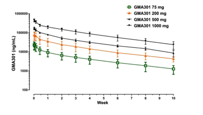 The selection of GMA301 doses and dosing frequency are based on the available clinical safety, tolerability and PK data obtained from the healthy human subjects of the Phase Ia study in Australia. The dose level of 1000 mg GMA301 observed in the previous study has been proven safe in human subjects. Patients in the ascending dose cohorts who are assigned to active GMA301 will be administered with 300, 600, or 1000 mg GMA301 every 4 weeks (Q4W) based on their assigned cohort. The study will be carried out at clinical sites in China and the US.