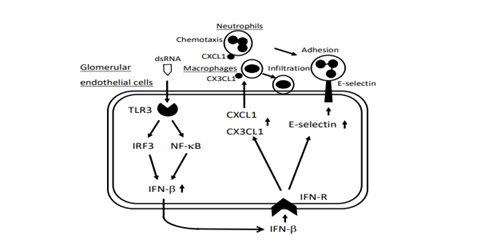 Figure 1: Postulated signaling pathways of TLR3, IRF3, NF-κB, and IFN-β in the expressions of neutrophil adhesion molecule, E-selectin, neutrophil chemoattractant, CXCL1, and macrophage chemoattactant, CX3CL1 induced by poly IC in GECs. TLR3: Toll-Like Receptor 3; IRF3: Interferon Regulatory Factor 3; GECs: Glomerular Endothelial Cells.
