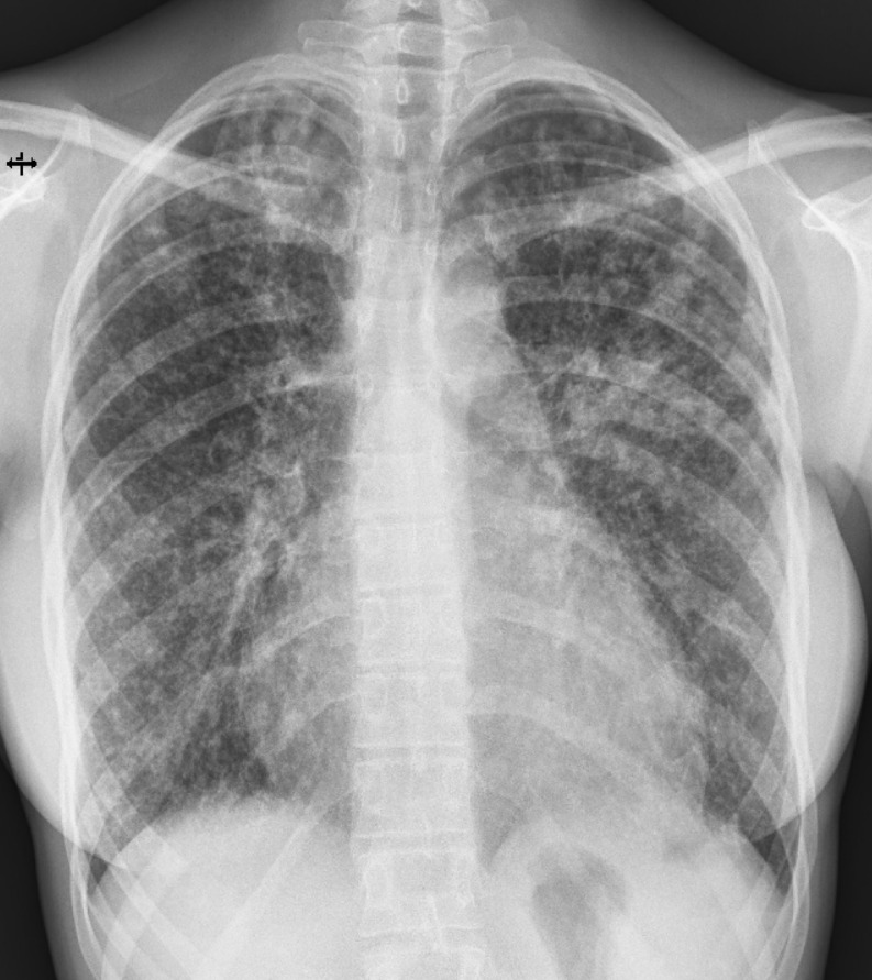 A woman in her 20s presented with a 3-week history of dry cough, exertional dyspnea, and fever, without night sweats or weight loss. She initially consulted her general practitioner, who prescribed antibiotic therapy and referred her for chest radiography. The chest X-ray demonstrated diffuse bilateral nodular opacities, consolidation in the left upper lobe, and cardiomegaly with an estimated cardiothoracic ratio of 0.64 (Figure 1). Based on these findings, she was referred to the Emergency Department of a tertiary care hospital the following day.