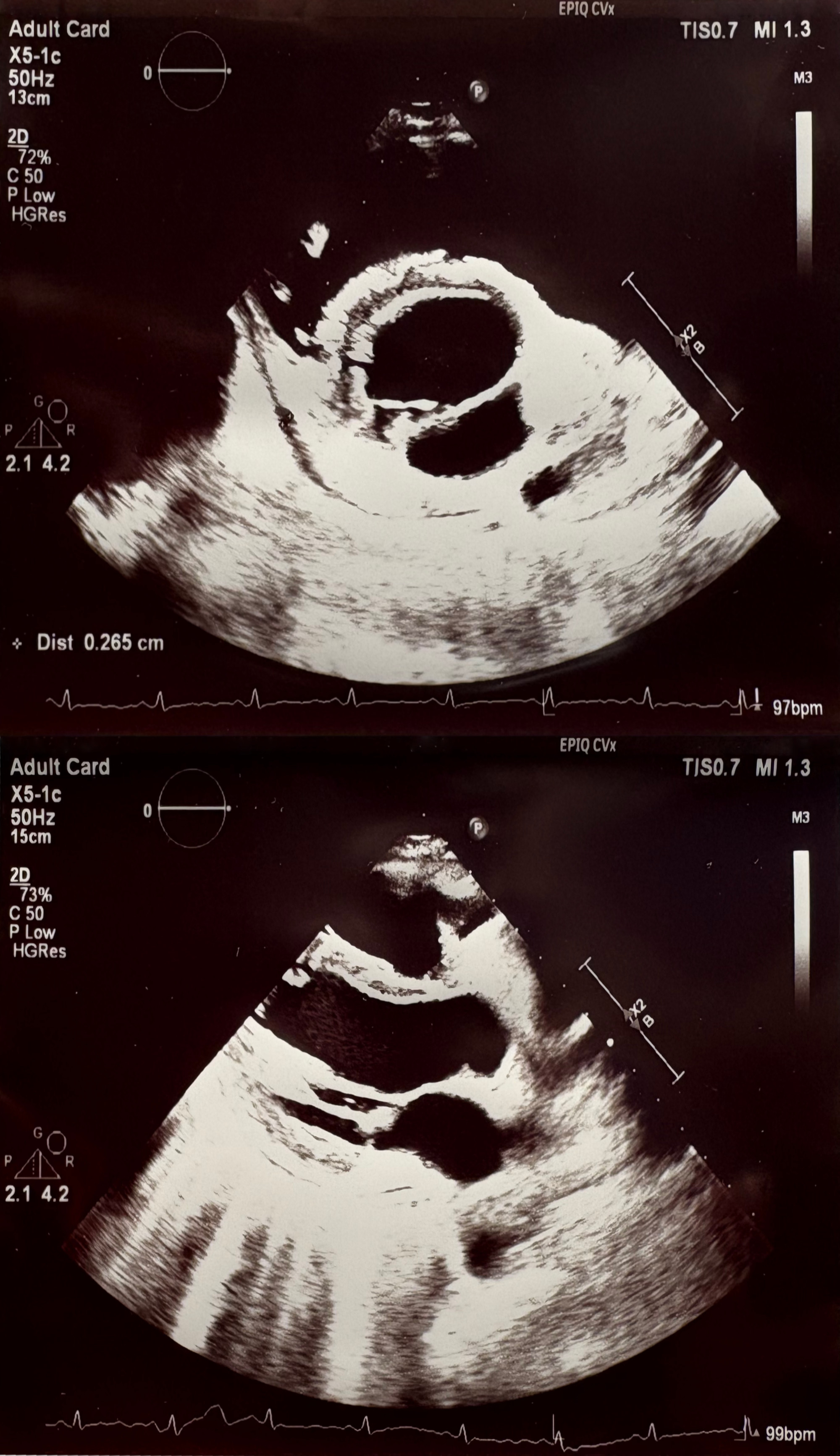 No further drainage output was observed after several days. Repeat transthoracic echocardiography performed approximately one week later demonstrated well-defined pericardial layers and complete resolution of the effusion (Figure 4), with otherwise normal cardiac findings, and the drain was removed.