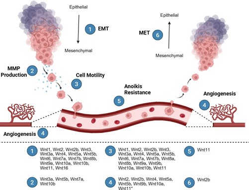 Figure 2. The metastatic cascade and the Wnt ligands involved. (1) Epithelial-to-mesenchymal transition (EMT). (2) Matrix metalloproteinase (MMP) production. (3) Cell motility. (4) Angiogenesis. (5) Anoikis resistance. (6) Mesenchymal-to-epithelial transition (MET). *Wnt11 has been implicated in vasculogenesis, a similar process to angiogenesis.