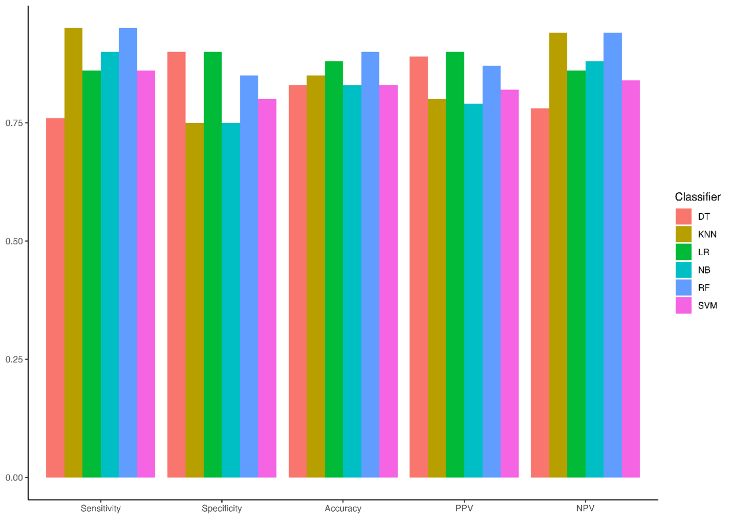 The performance of six machine learning models: K-Nearest Neighbors (KNN), Support Vector Machine (SVM), Naïve Bayes (NB), Decision Tree (DT), Random Forest (RF), and Logistic Regression (LR) was evaluated using sensitivity, specificity, accuracy, positive predictive value (PPV), and negative predictive value (NPV). The detailed results are summarized in Figure 1. Among the classifiers, RF achieved the highest accuracy (0.90) and specificity (0.85), with sensitivity equal to KNN (0.95). KNN also demonstrated high sensitivity (0.95) and a strong NPV (0.94), though its specificity was lower (0.75). LR showed a balance between specificity (0.90) and sensitivity (0.86) with an overall accuracy of 0.88. NB and SVM achieved similar accuracy scores (0.83), with NB showing slightly higher sensitivity (0.90) but lower specificity (0.75). The DT model had the lowest sensitivity (0.76) but the highest PPV (0.89), indicating strong performance in positive class prediction. Overall, RF demonstrated the highest classification performance, followed by LR and KNN, based on accuracy and sensitivity.