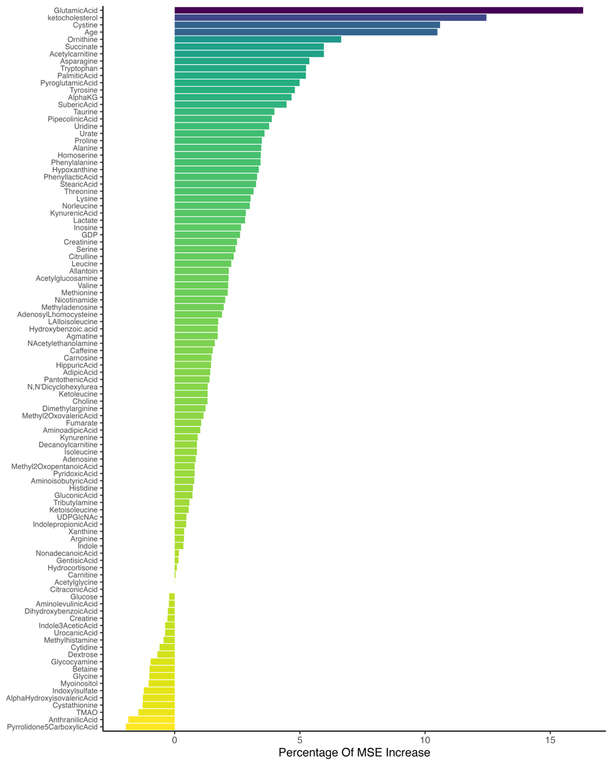 To determine the most influential features in classification performance, the Percentage Increase in Mean Squared Error (%IncMSE) was used as the importance metric. Figure 2 presents the ranking of key features based on this measure, identifying the top 10%. Among them, glutamic acid (16.31) exhibited the highest value, emphasizing its strong contribution to model accuracy. Other significant features within the top 10% included ketocholesterol (12.45), cysteine (10.60), age (10.49), ornithine (6.65), succinate (5.96), acetylcarnitine (5.96), asparagine (5.38), tryptophan (5.25), and palmitic acid (5.24), all of which played a crucial role in model performance.