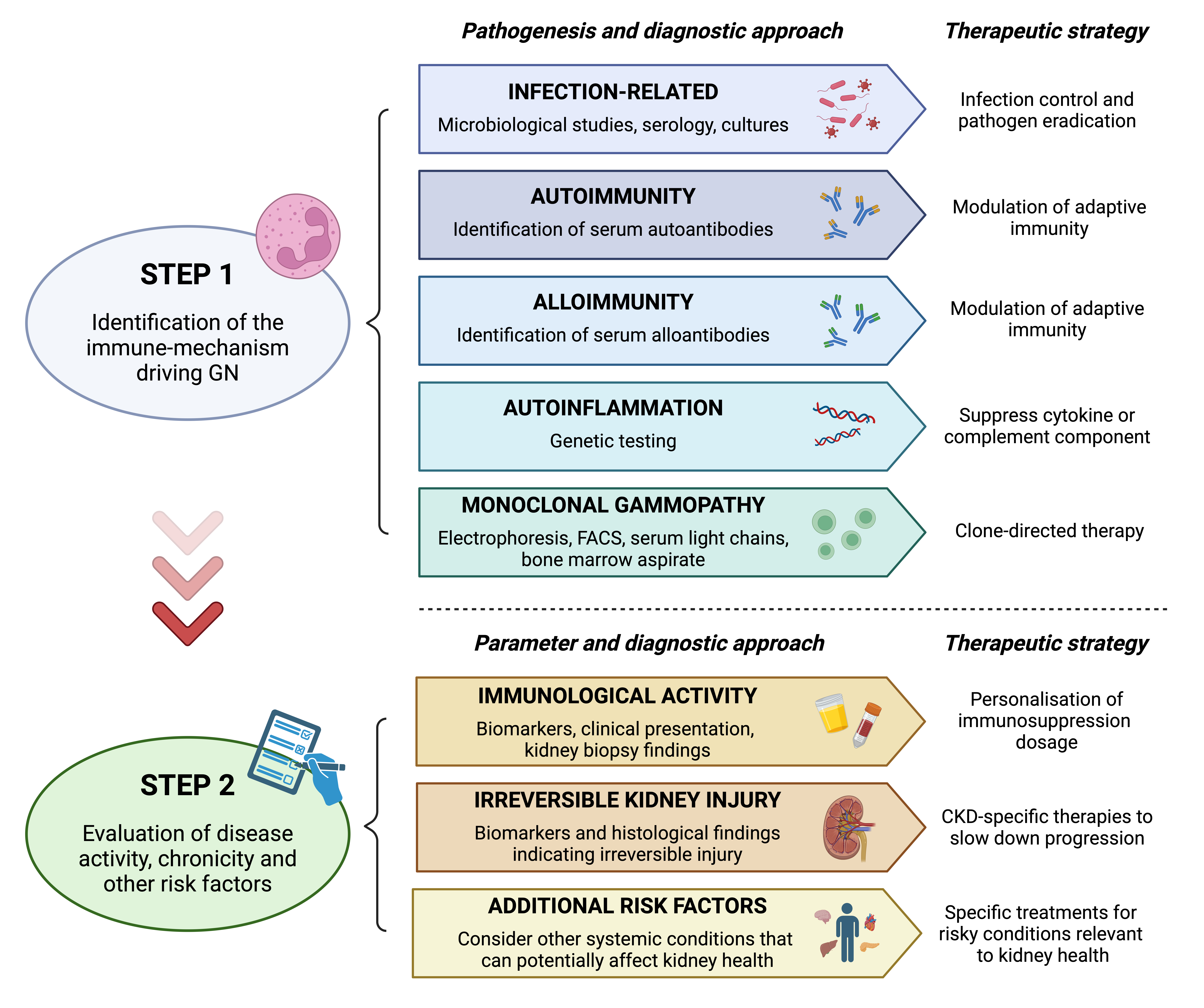 Figure 1. Algorithm to classify and treat glomerulonephritis. In the first step, immune pathogenesis needs to be identified to guide treatment. In the second step, immunological activity, chronic kidney injury and additional systemic risk factors should be considered to obtain patient-individual treatment strategies.