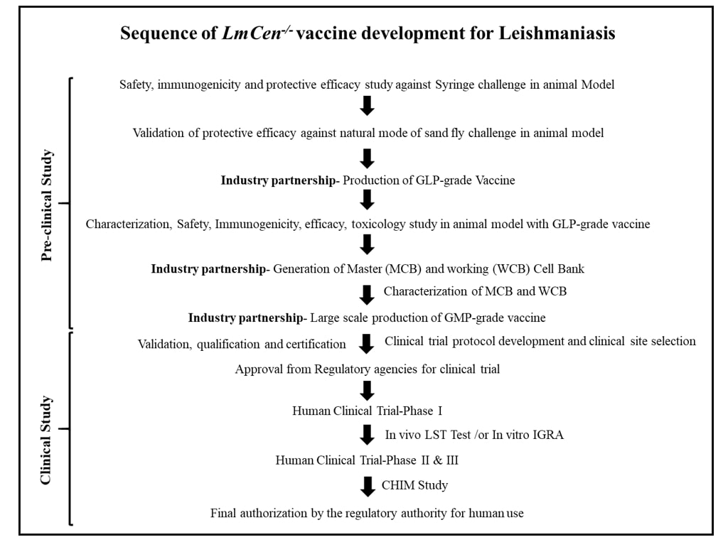 Beyond pre-clinical studies, to evaluate the vaccine potential of a live attenuated vaccine for human clinical trial, several prerequisite need to be satisfied for approval by the regulatory agencies. This include the vaccine strain should be manufactured under current Good Manufacturing Practice (cGMP). Towards achieving this goal, researchers manufactured LmCen-/- parasites under Good Laboratory Practice (GLP) conditions, in a cGMP compliant facility in collaboration with their industry partner, Gennova Biopharmaceuticals Ltd., India. GLP-grade LmCen-/- parasites produced in large scale are also safe, induced significant host protection and prevents mortality against natural mode of sand fly challenge. Importantly, their long-lasting protective efficacy further satisfied the essential characteristics of an efficacious vaccine. In addition, an IFN-γ dominated immune response in PBMCs of healthy human volunteers living in non-endemic regions (United States of America, USA) suggested that LmCen-/- is ready to be tested in human’s clinical trial, corroborated by Osman et al. study [27]. However, the immunological response from non-endemic region human PBMCs needs to be further validated by the GMP-grade parasites in future studies.