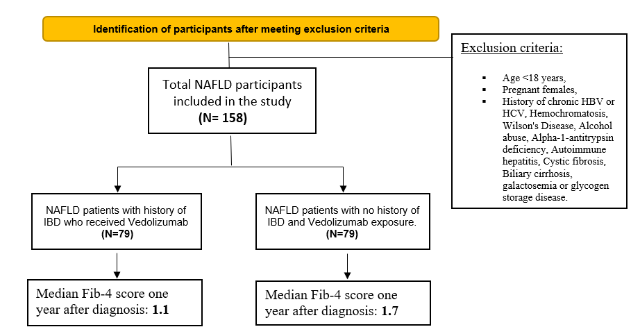 Methods: We conducted a retrospective cohort analysis of 158 subjects with NAFLD who received Vedolizumab at Cleveland Clinic Foundation (CCF). One cohort of 79 patients with NAFLD who received Vedolizumab were matched with control group of 79 patients. We determined the primary outcome as the response to Vedolizumab measured as Fibrosis-4 (Fib-4) regression to <1.3 points after one year of treatment.