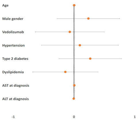 There was no statistically significant difference in response (p= 0.576), progression of the disease (p= 1.000), or change in the number of cirrhosis decompensation episodes (in those with NAFLD cirrhosis) among Vedolizumab recipients. The predictors for response are shown in Figure 2.
