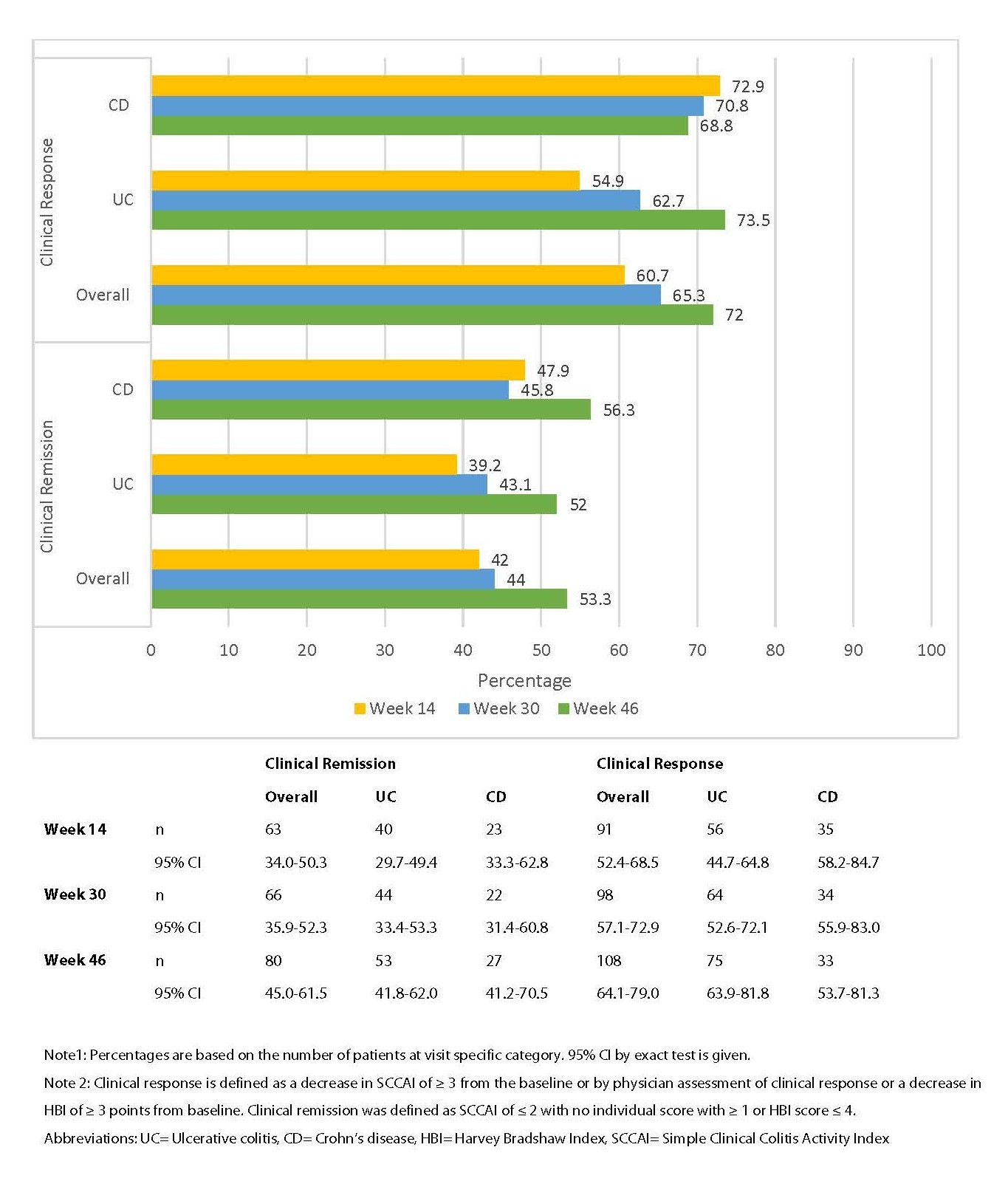 Results: A total of 150 patients were enrolled (102 with UC; 48 with CD). Adverse Events (AE) affected 83 patients (55.3%), with mild AE in 72 (48%). Treatment related adverse events (TEAE) occurred in 52 (51%) patients with UC and 29 (60.4%) with CD, Serious adverse events (SAE) occurred in 8 (5.3%) patients. Additionally, 3.3% had at least 1 Adverse drug reaction (ADR), and 2.7% had adverse events of special interest (AESI). Reported ADR/AESI cases included one patient each with pulmonary tuberculosis, tuberculous pleurisy, rectal adenocarcinoma, and hypertension. Overall clinical response rates for weeks 14, 30 and 46 were 60.7%, 65.3%, and 72% and remission rates were 42%, 44%, and 53.3% respectively. Mucosal healing was observed in 18% patients at week 46 (23 (22.5%) with UC; 4 (8.3%) with CD). Quality of life scores showed improvements across both UC and CD groups, with increases noted from baseline of 5 at week 14 to 13 at week 46 in both groups.