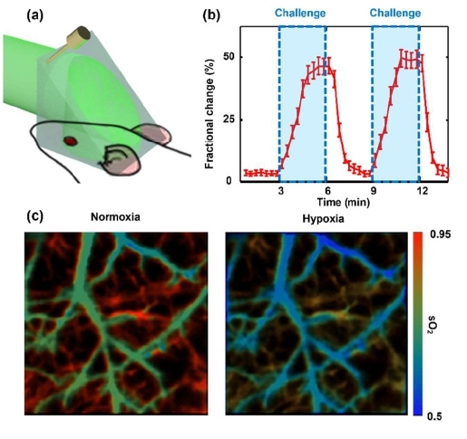 Figure 2: High-speed imaging of sO2 changes in a mouse brain. (a) Wide-field imaging of the mouse brain. (b) Time course of fractional signal changes during oxygen challenge. (c) Wide-field images of sO2 in the cortical vessels before (normoxia) and after (hypoxia) the challenge.