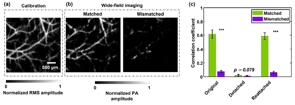During the demonstration, one mouse was mounted in a stereotaxic frame, and the cortical vasculature was imaged in calibration mode (Figure 3a). During the wide-field imaging, the mouse was first detached from the ER, then reattached to the same position. The same procedure was repeated for a second mouse. The wide-field images of the first mouse’s vasculature were reconstructed using the calibration data of both itself and the second mouse. As a result, the wide-field image reconstructed from the calibration data of itself (matched) recovered the original vasculature, while the wide-field image reconstructed from the calibration data of the second mouse (mismatched) revealed no visible features (Figure 3b). The correlation coefficients between the calibration images and the wide-field reconstruction images were calculated, as shown in Figure 3c. The wide-field images reconstructed with the matched calibration data show much higher correlation than those reconstructed from the mismatched calibration data. The vasculature is also recovered after being repositioned to the ER.
