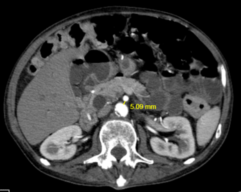 Figure 1. CT with IV contrast, axial section showing a reduced aortomesenteric distance of 5 mm.