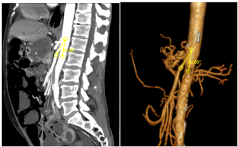 Figure 2. CT with IV contrast, sagittal section and 3D reconstruction showing a reduced aorto-mesenteric angle of 20°.