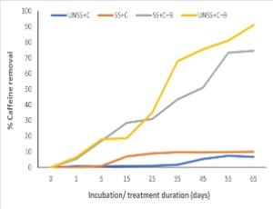 Degradation of Caffeine, artificially impregnated in sterile and unsterile soil, studied under ambient conditions using the Himalayan psychrotolerant Pseudomonas sp. (GBPI_Hb5). The caffeine degradation was found increased significantly in presence of GBPI_Hb5. The t1/2 value was estimated during kinetic study of caffeine degradation both in the presence and absence of bacteria in sterilized and unsterilized soil samples, which was also found reduced significantly.