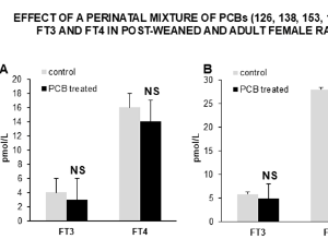 Polychlorinated Biphenyls (PCBs) are endocrine disruptors that may act as thyroid hormone (TH) analogues/antagonists to alter the homeostasis of the thyroid axis. Recently, we have shown that perinatal exposure to Aroclor 1254 (A1254), a commercial mixture of more than 90 PCB congeners, leads to sex-specific changes of the thyrotropin-releasing hormone (TRH) mRNA synthesis in hypophysiotropic neurons of the hypothalamic paraventricular nucleus (PVN), and thyroid-stimulating hormone (TSH) serum levels in adult rats.