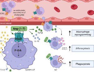 Angiotensin-(1-7) [Ang-(1-7)] is a biologically active peptide of the renin–angiotensin system (RAS) that counterbalances the actions of angiotensin II (Ang II), primarily through binding to the Mas receptor (MasR). This axis exerts significant immunomodulatory effects by influencing several features of leukocytes, including macrophage function, a central component in the resolution of inflammation. Macrophages contribute to tissue homeostasis by clearing apoptotic cells, releasing anti-inflammatory mediators and supporting tissue repair.