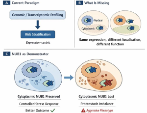 Breast cancer remains a heterogeneous disease in which prognostic stratification, particularly within estrogen receptor (ER)-negative subtypes, remains clinically challenging. While genomic and transcriptomic profiling have advanced risk classification, protein-level regulation and subcellular localization are rarely incorporated into prognostic frameworks. NEDD8 ultimate buster 1 (NUB1) is a proteostasis-associated protein involved in degradation of ubiquitin-like modifiers and regulation of cell-cycle progression.
