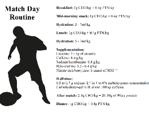 Many questions arise from what may or may not be applicable for an elite soccer player to do during the competitive match day. Currently, we know that athletes are concentrated in hotels and there they receive all the food for the day, i.e., the match day diet. Besides that, the supplementation is usually offered at the stadium.
