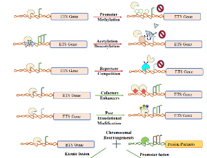 E-26 Transformation Specific (ETS) transcription factors are known to cause various cancers and their aberrant expression has been related to various oncogenic processes like metastasis and angiogenesis. Currently very few drugs exist which can directly target oncogenic transcription factor and none of them are approved for human use. To design ETS transcription factor targeting small molecules, an understanding of their regulation in cancers is essential. In this review, we have discussed upstream transcriptional regulations of ETS factors that includes epigenetic