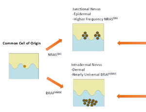 There is striking clinical, histological, and molecular diversity observed across melanocytic tumors. Activating mutations in BRAF and NRAS are well-established initiators of benign melanocytic nevi and melanoma. However, accumulating evidence reveals that the biological outcome after oncogene activation is dependent on cellular state differences that vary by anatomic site, developmental timing, and cell of origin.
